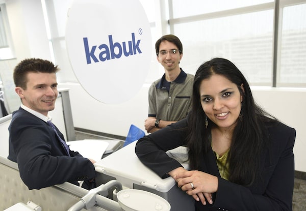 From left, the co-founders of Kabuk : Lucas Litwiniuk, Babak Bagherizadeh and Asha Soares in the company's downtown office on June 5 2015.Fred Lum/The Globe and Mail