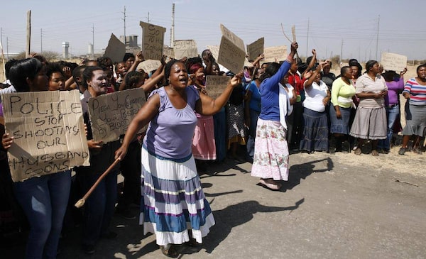 Women protest against the police near the scene of the shooting at the Lonmin mine on Friday, Aug. 17, 2012.THEMBA HADEBE/The Associated Press