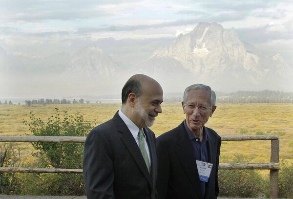 Federal Reserve Chairman Ben Bernanke, left, and Bank of Israel Governor Stanley Fischer walk together outside of the Jackson Hole Economic Symposium, Friday, Aug. 31, 2012.Ted S. Warren/The Associated Press