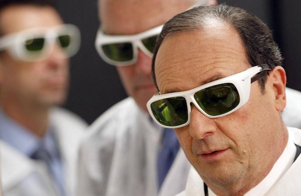 French President Francois Hollande wears protective glasses as he visits a manufacturing facility in Pessac, France, Jan. 10. Mr. Hollande will meet with United Arab Emirates ruler, Sheikh Khalifa bin Zayed al-Nahayan, on Tuesday to promote Total SA for $10-billion gas deal.REGIS DUVIGNAU/Reuters