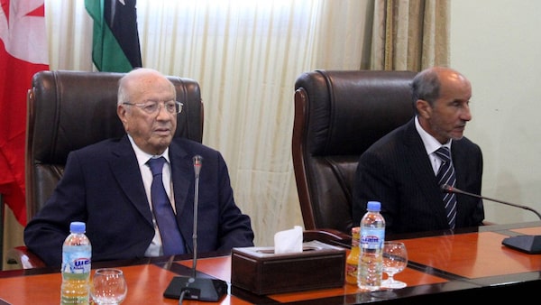 Tunisian Prime Minister Beji Caid Essebsi, left, and Libya's interim leader Mustafa Abdel Jalil met Wednesday, Oct. 12, 2011, in the eastern city of Benghazi, Libya. ABDULLAH DOMA/AFP/Getty Images)ABDULLAH DOMA/AFP / Getty Images