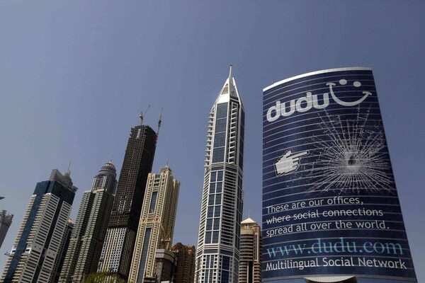 An advertisement for multilingual social network Dudu is seen on a building in Dubai Sept. 23, 2012. Middle East telcos are discussing the idea of creating a pan-Arab online platform to challenge Facebook and others.JUMANA EL HELOUEH/Reuters