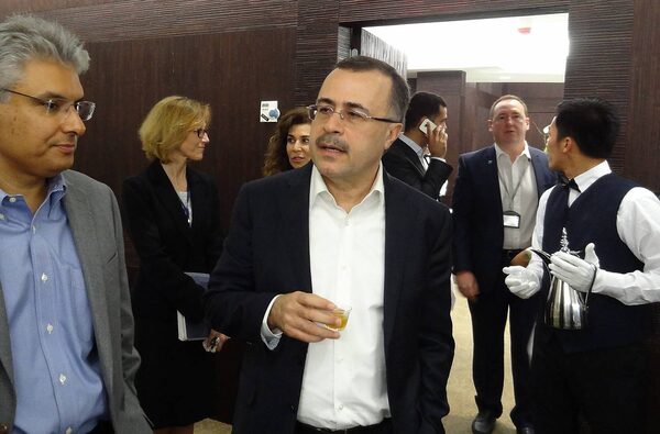 Aramco President and CEO Amin Nasser (C) chats with colleagues before addressing visiting journalists at the company headquarters, on May 10, 2016. Saudi Arabia slashed the tax rate paid by state oil producer Saudi Aramco, a key milestone in preparing the company for what may be the world’s biggest initial public offering.IAN TIMBERLAKE/AFP / Getty Images