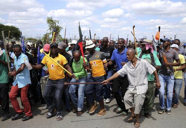 Mine workers protest outside the Lonmin mine in Rustenburg, northwest of Johannesburg Jan. 23, 2014. South African mines producing half the world’s platinum shut down on Thursday as the country’s hardline miners’ union began a strike for hefty pay hikes their employers say they cannot pay.SIPHIWE SIBEKO/Reuters