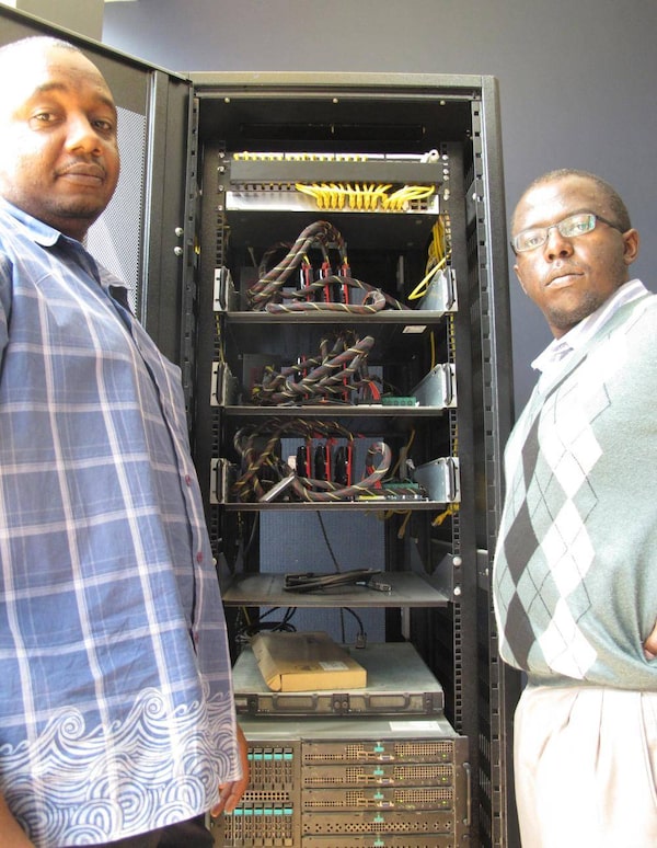 Jimmy Gitonga, left, and Phares Kariuki, right, with the supercomputer they helped build in Nairobi – one of the first ever to be built in Africa.Geoffrey York/The Globe and Mail