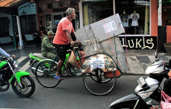 A tricycle driver transports ballot boxes that are being distributed to polling stations in Yogyakarta, Indonesia, Tuesday, July 8, 2014. As the world's third-largest democracy prepares to elect a new president Wednesday, Indonesians are divided between two very different choices: a former furniture maker, Jakarta Governor Joko Widodo and a wealthy ex-army general with close links to former dictator Suharto, Prabowo Subianto.Slamet Riyadi/The Associated Press