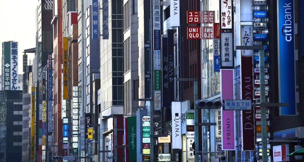 Signs hang outside commercial buildings in the Ginza district of Tokyo, in this file photo. For 10 days, Amazon is going to sell beer, wine, sake and cocktails in the glitzy district to promote alcoholic products sold on its website in Japan.Akio Kon/Bloomberg
