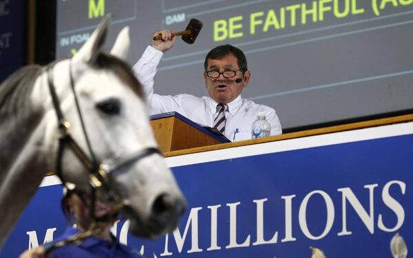 An auctioneer brings his hammer down for $5,200 (U.S.) for the first broodmare at the opening of the three-day auction of 350 horses. Mr. Tinkler is raising funds with the out-of-season sale that began on Tuesday.TIM WIMBORNE/Reuters