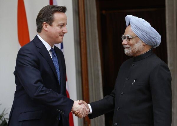 Indian Prime Minister Manmohan Singh, right, and British Prime Minister David Cameron shake hands before a meeting in New Delhi, India, Tuesday, Feb. 19, 2013. On his second visit to Britain's former colony, Cameron led a delegation of more than 100 British CEOS and investors and stopped first in Mumbai, India's financial capital.Saurabh Das/The Associated Press