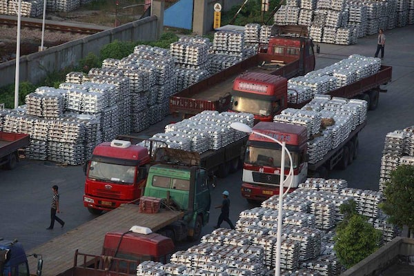 Workers walk through an aluminium ingots depot in Wuxi, Jiangsu province Sept. 26, 2012.ALY SONG/Reuters