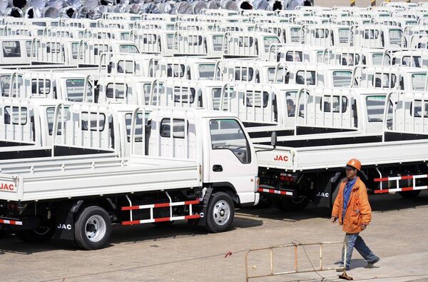 A worker walks past Chinese trucks for exporting at a port of Liangyungang, Jiangsu province, March 31, 2013. China's official manufacturing purchasing managers' index (PMI) released by the National Bureau of Statistics rose to an 11-month high of 50.9 in March, above the 50-point level that indicates growth on the month.CHINA DAILY/Reuters