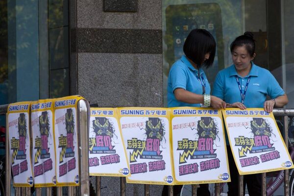 Employees of a Suning appliance shop puts up sales promotional posters outside a mall in Beijing, China, Wednesday, Aug. 15, 2012.Alexander F. Yuan/The Associated Press
