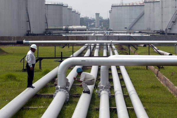 Employees of Indonesia's state-owned oil company Pertamina inspect pipes linking oil storage tanks at the company's main depot in north Jakarta.DADANG TRI/Reuters