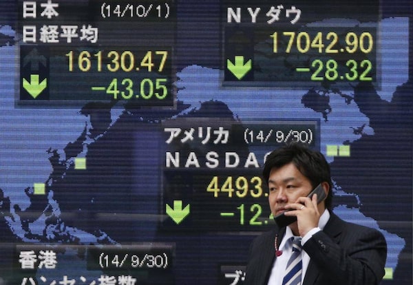 A businessman speaks on a cellphone in front of the stock market index on an electronic board in Tokyo, Wednesday, Oct. 1, 2014.Shuji Kajiyama/The Associated Press