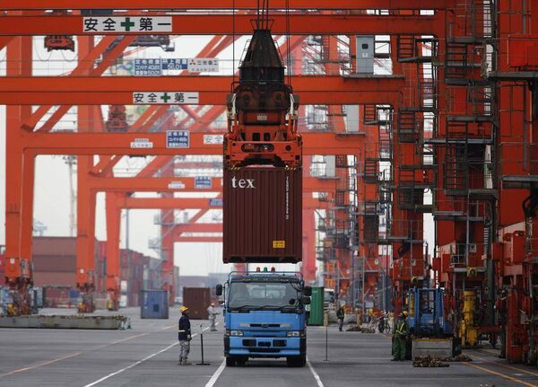 Workers load a container on a truck at a port in Tokyo Nov. 12, 2012. Japan's economy shrank 0.9 per cent in the three months to September, marking the first contraction in three quarters, adding to signs that slowing global growth and tensions with China are nudging the world's third-largest economy into recession.YURIKO NAKAO/Reuters