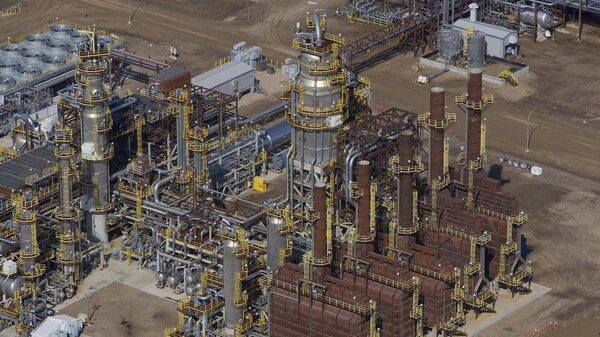 Aerial view of the OrCrude Unit at Nexen's Long Lake Phase I SAGD oil sands processing facility in background. Long Lake is located 40 kilometres south east of Ft. McMurray, Alberta.Dave Olecko