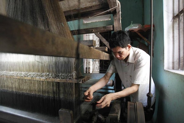 Chien Nguyen, 48, works at a weaving machine at his house in Van Phuc. Weavers in the village make about $10 per day.KHAM/Reuters