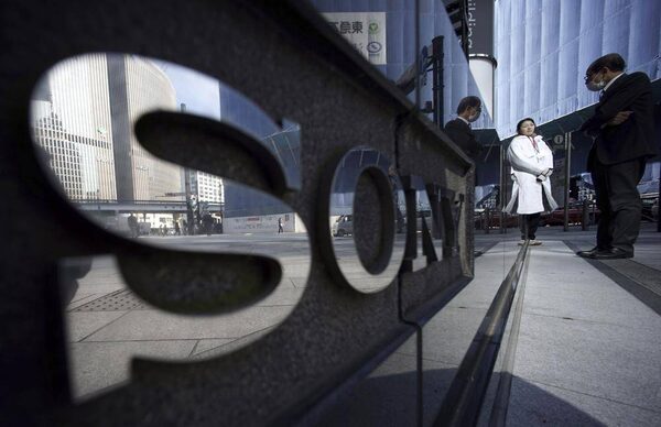 People stand near the Sony Building at Ginza shopping district in Tokyo Wednesday, Feb. 4, 2015. Sony Corp. on Wednesday trimmed its forecast of losses for the year that ends in March and said it doesn't expect the hack at Sony Pictures to hurt its finances overall.Eugene Hoshiko/The Associated Press