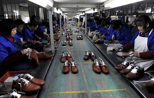 Employees work at a shoe factory in Lishui, Zhejiang province, Jan. 24, 2013.LANG LANG/Reuters