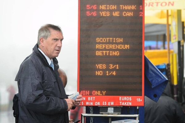 A bookmaker takes bets on a 'Referendum Race' sponsored by the bookmakers Ladbrokes at Musselburgh racecourse in Edinburgh, Scotland, on September 15, 2014, ahead of the referendum on Scotland's independence.AFP / Getty Images