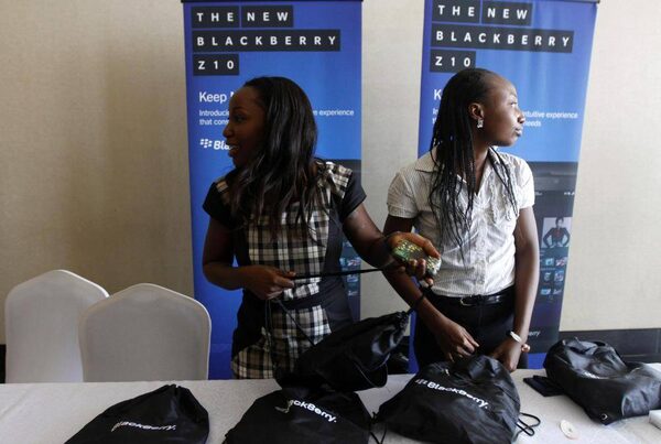Women stand at a reception table during the launch of the new BlackBerry Z10 smartphone in Lagos March 7, 2013.AKINTUNDE AKINLEYE/Reuters