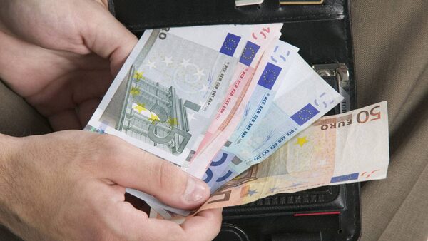 Close-up of hand holding euros by a walletJupiterimages/Getty Images