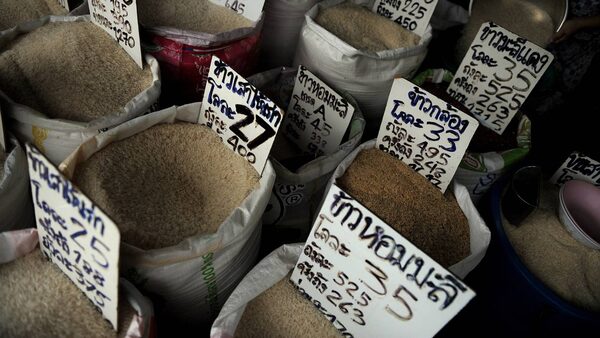 A Thai vendor fills bags with a variety of rice at a shop at a market in Bangkok on Sept. 25, 2011. A populist policy aimed at boosting the incomes of Thai farmers has raised fears of global rice price turbulence, but experts say the kingdom could just be hurting itself.CHRISTOPHE ARCHAMBAULT
