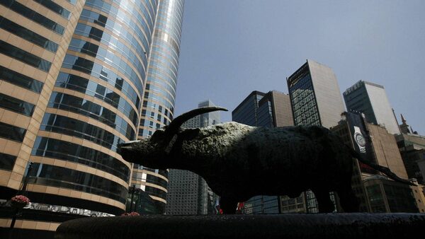 A statue of a bull is seen outside Exchange Square (L), where the trading hall of the Hong Kong Stock Exchange is located, May 24, 2010.Bobby Yip/Reuters