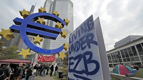 Demonstrators stand between protest banners underneath the euro sign in front of the European Central Bank in Frankfurt, central Germany, Monday, Oct. 17, 2011. Protestors gathered at many major European cities last Saturday to join in demonstrations against corporate greed and inequality and to support the US movement ' Occupy Wall Street'. About 150 protestors in Frankfurt remained at that place , some with tents.Thomas Lohnes