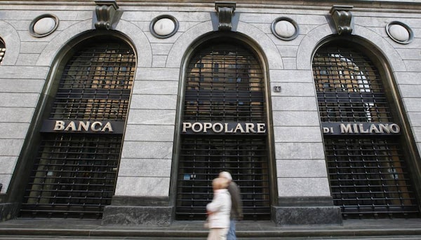 A couple walk past a Banca Popolare di Milano bank branch in Milan, Italy, Sunday, Oct.26, 2014.Luca Bruno/The Associated Press