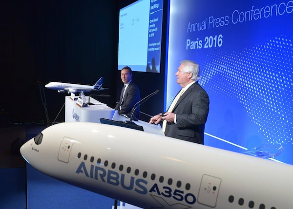 Airbus CEO Fabrice Bregier listens to Airbus Chief Operating Officer Customers John Leahy during the company's annual press conference in Paris on January 12, 2016.ERIC PIERMONT/AFP / Getty Images