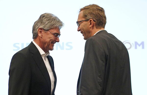 Siemens CEO Joe Kaeser, left, smiles with Alstom CEO Henri Poupart-Lafarge in Paris on Wednesday. The companies are set to join forces as they seek to halt the advance of Asian rail giants.Thibault Camus/The Associated Press