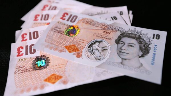 Sample polymer 10- GB pound banknotes are seen on display at the Bank of England in London.Reuters