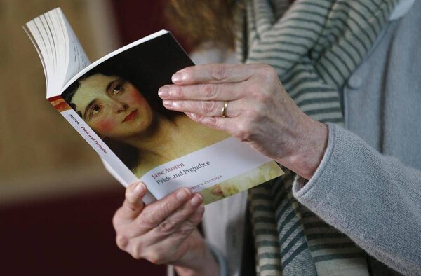 Jane Austen expert Hazel Jones reads from Austen's novel "Pride and Prejudice" during a twelve hour live readathon at the Jane Austen Center in Bath, southern England January 28, 2013. Former Bank of Canada Governor Mark Carney faces the issue of whether Austen should replace Charles Darwin on Britain’s 10 pound note.SUZANNE PLUNKETT/Reuters