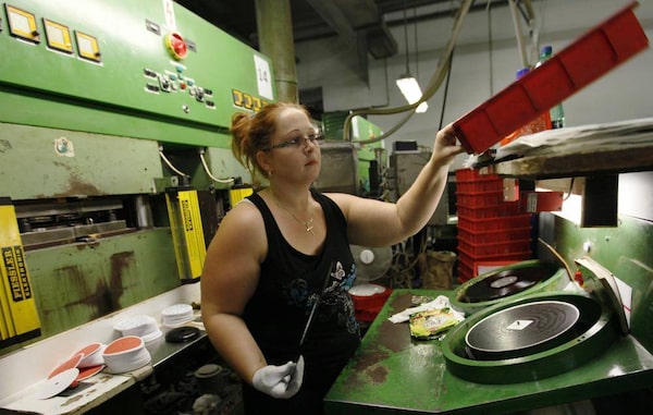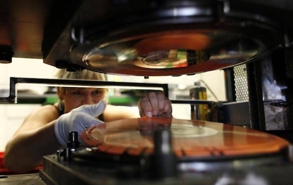 Employee Helena Zakova works at a press machine as part of the creation process for vinyl records. GZ Media says it is the world’s biggest vinyl record producer, making records for Universal Music Group, Sony Music and is now beginning to co-operate with Warner Music.PETR JOSEK/Reuters