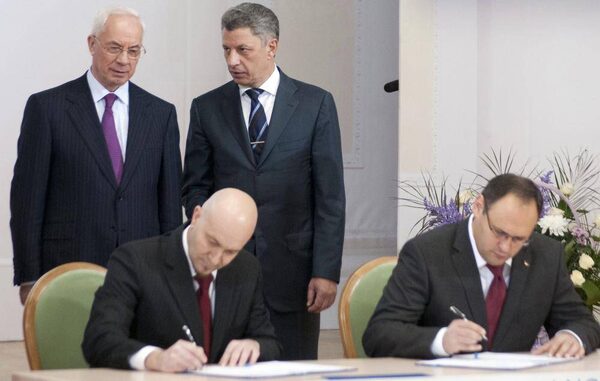 Ukrainian Prime Minister Mykola Azarov, top left, and Energy Minister Yuri Boiko, right, talk as Vladislav Kaskiv, right, the head of Ukraine’s state investment agency, and a man the state investment agency identified as Jordi Sarda Bonvehi sign what the government thought was an agreement to build a liquefied natural gas terminal in Ukraine in Kiev Nov. 26, 2012.STRINGER/Reuters