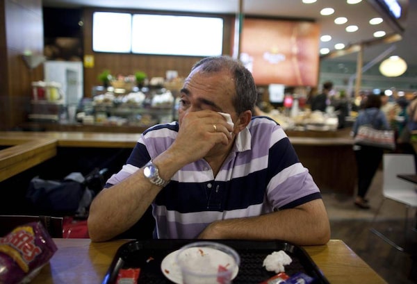 Jose Manuel Abel, 46, cries as he waits to catch a flight to Munich at El Prat airport in Barcelona June 29, 2012. A former salesman, Abel has been unemployed for more than two years. He has decided to leave his family and move to Germany to work in a Spanish restaurant.Marcelo del Pozo/Reuters