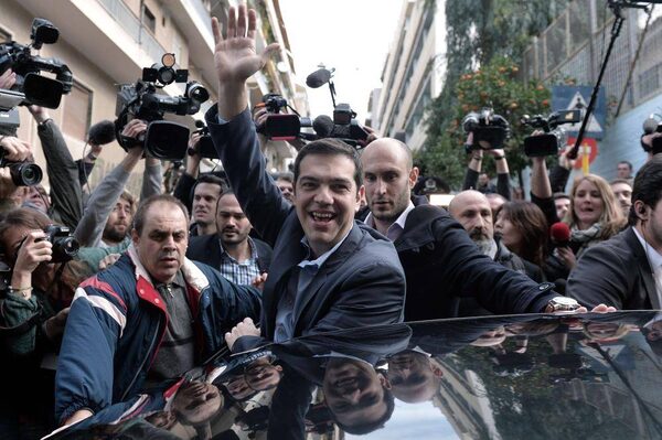 Head of Syriza leftist party Alexis Tsipras greets supporters after casting his vote in a polling station in Athens for Greece's general elections on January 25, 2015.LOUISA GOULIAMAKI/AFP / Getty Images