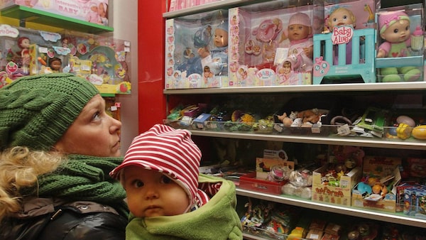 Mother of three Jana Papulakova, 31, holds her toy purchases outside the Alltoys toy shop in Trencin, Slovakia, as her 2-year-old son Tobias sits on a ride. Ms. Papulakova plans to buy as much for her children this year as she did in 2010.RADOVAN STOKLASA/Reuters
