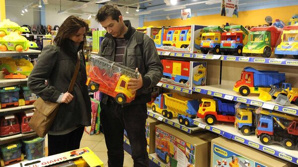 Mortgage broker Nada Helikova, 28, and her husband Milos Helik, 29, who do not yet have children, look at a toy truck inside the Alltoys toy shop in Trencin, Slovakia.RADOVAN STOKLASA/Reuters