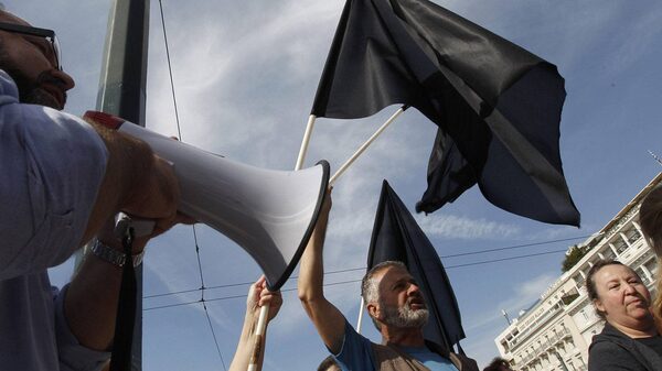Protesters wave black flags in front of the Greek parliament on Friday, Oct. 21, 2011. About 500 civil servants protested against new austerity measures. Greek unions on Friday threatened new anti-austerity strikes next week, after parliament approved deeply-resented new cutbacks. AP Photo/Petros GiannakourisPetros Giannakouris/The Associated Press