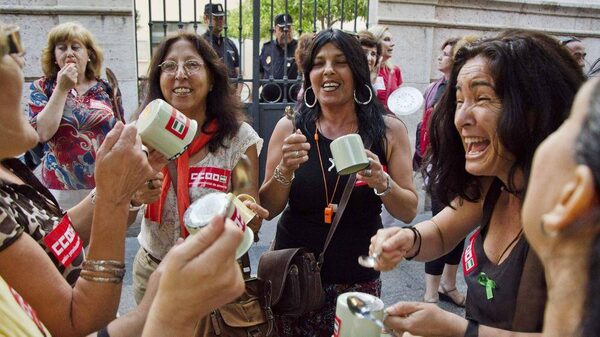 Demostrators on Wednesday bang pots to protest against the labour reforms by the Spanish government in front of the regional government's delegation in Almeria.FRANCISCO BONILLA/Reuters