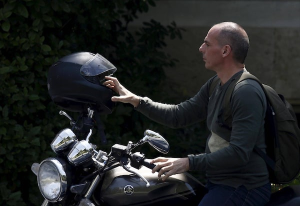 An avid motorcyclist, Yanis Varoufakis arrives on at Maximos Mansion to attend a meeting with Prime Minister Alexis Tsipras in Athens in May, 2015.Kostas Tsironis/Reuters