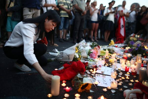 People gather and lay tributes on the Promenade des Anglais on July 15, 2016 in Nice, France. A French-Tunisian attacker killed 84 people as he drove a lorry through crowds, gathered to watch a firework display during Bastille Day Celebrations. The attacker then opened fire on people in the crowd before being shot dead by police.Carl Court/Getty Images