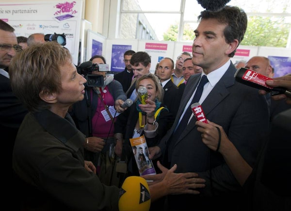 Head of the French employers’ federation MEDEF Laurence Parisot, left, talks to Arnaud Montebourg, industry minister, right, in Jouy-en-Josas, Aug. 31, 2012.Jacques Brinon/The Associated Press