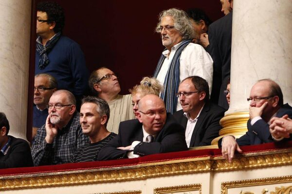 Walter Broccoli, top right, an ArcelorMittal worker from the Florange site and labour union representative, listens with colleagues to questions about the plant’s future at the National Assembly in Paris Nov. 28, 2012.CHARLES PLATIAU/Reuters