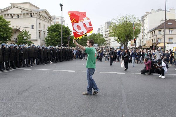 A demonstrator waves the flag of the General Confederation of Labour (CGT) during a protest against the government's labour market reforms in Paris, on May 26, 2016. The French government's labour market proposals, which are designed to make it easier for companies to hire and fire, have sparked a series of nationwide protests and strikes over the past three months.MATTHIEU ALEXANDRE/AFP / Getty Images