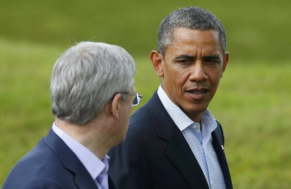 Canada's Prime Minister Stephen Harper, left, walks with U.S. President Barack Obama after a G8 summit group photograph was taken at the Lough Erne golf resort in Enniskillen, Northern Ireland June 18, 2013.ANDREW WINNING/Reuters