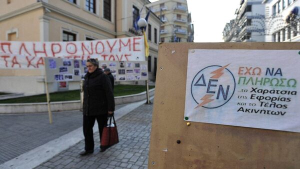 A sign playing on the Greek acronym of dominant electricity producer Public Power Corporation reads 'I can't pay additional taxes and the property levy,' in central Veria, northern Greece, on Friday, Nov. 18, 2011. As two years of pay cuts and tax hikes pummel living standards in debt-crippled Greece, many in this northern town can't pay for basic utilities such as electricity - and get cut off from the grid.Nikolas Giakoumidis/AP