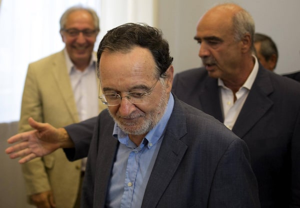 Greek former Energy Minister and leader of the leftist Popular Unity party Panagiotis Lafazanis (front) arrives for a meeting with Evangelos Meimarakis (R), leader of the conservative New Democracy party at the parliament in Athens, Greece, August 22, 2015.STOYAN NENOV/Reuters